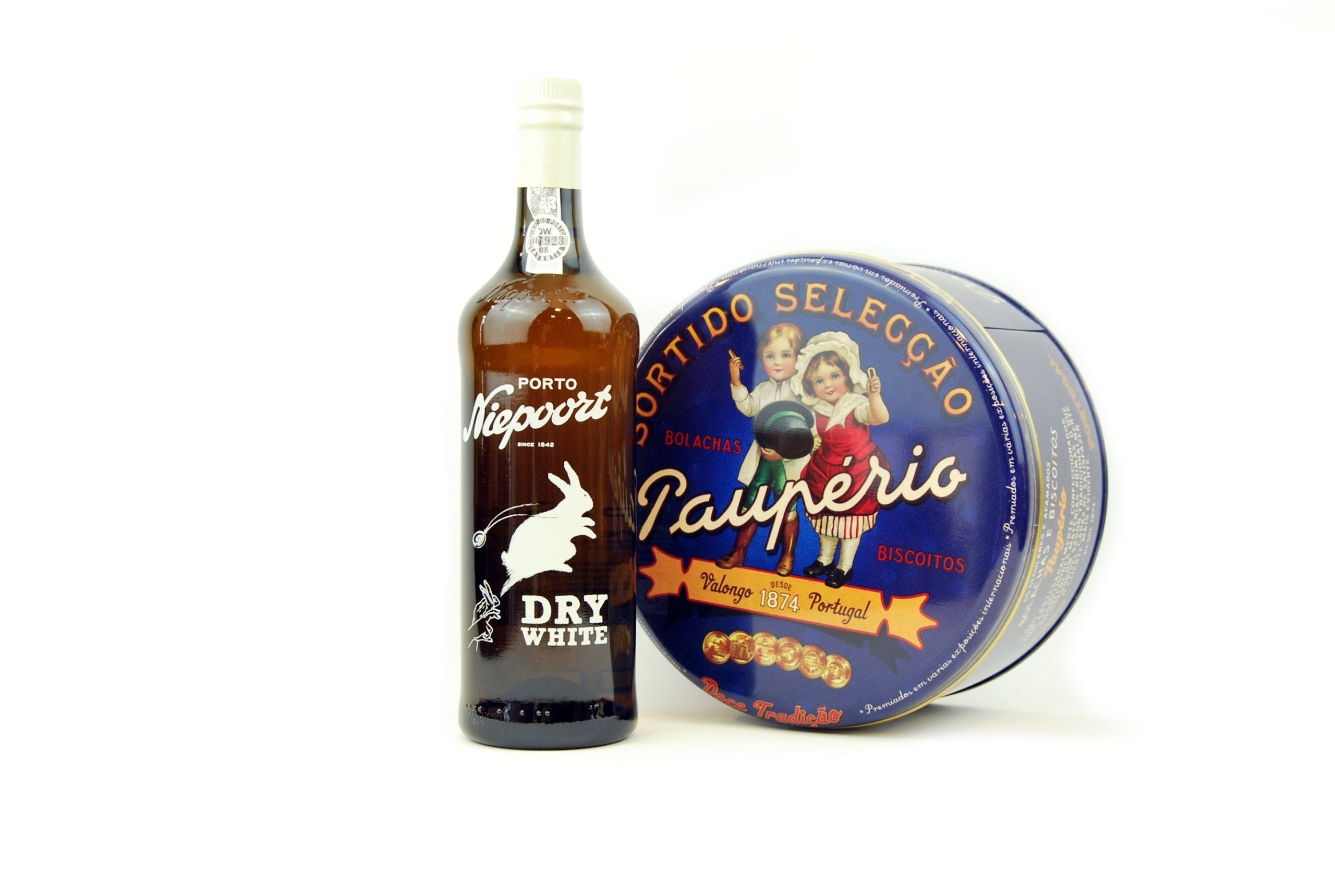 Contem 1 garrafa de Vinho do porto Niepoort Dry White 75cl e 1 sortido lata Selecção Paupério 900g